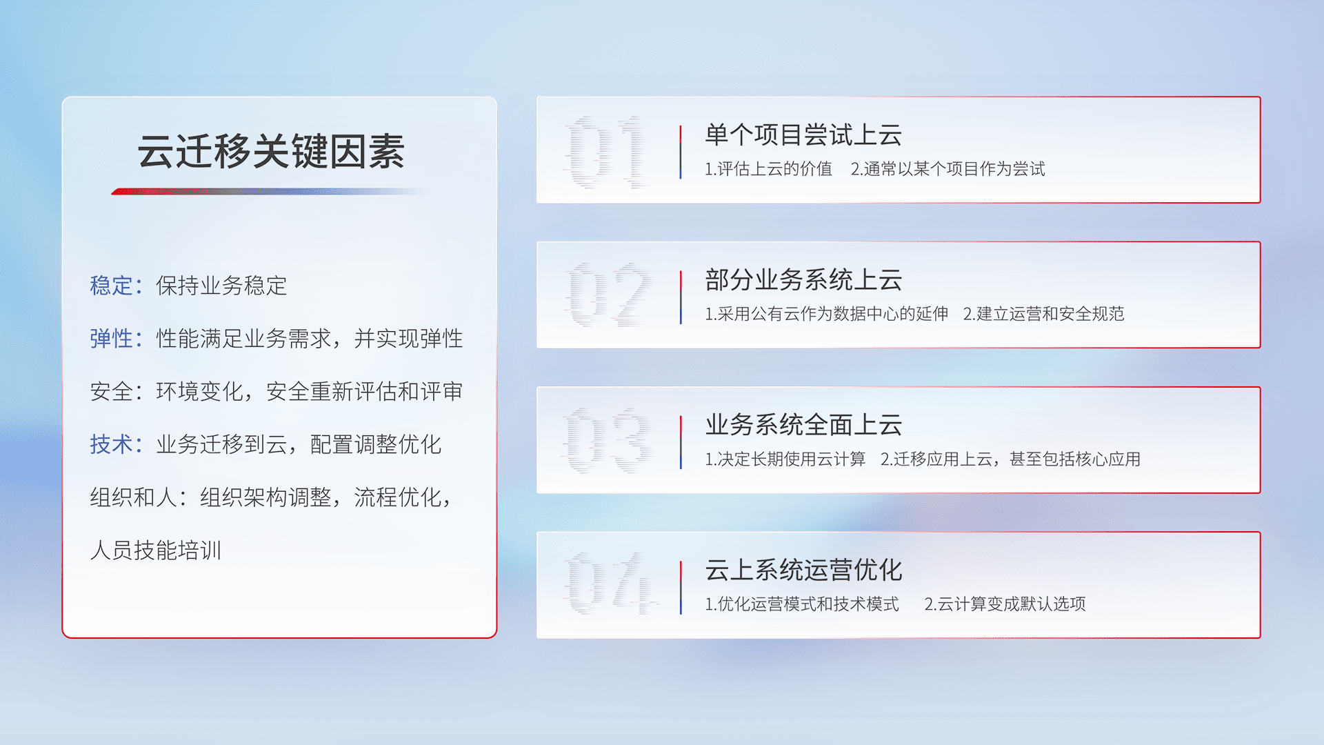 结合实际业务,,,从规划设计、、云平台选型、、、云原生改造、、数据迁移、、、、集成交付,,,迁移全过程为客户识别最佳上云路径,,,做好风险识别管理,,,,设计网络架构、、、、身份权限、、、安全审计合规、、、、操作审计、、日志审计、、、监控告警策略、、、、多站点容灾设计等,,,对云上基础设施进行整体规划,,提升IT治理水平,,,以满足弹性、、、、高可用、、高性能的需求。。。。
