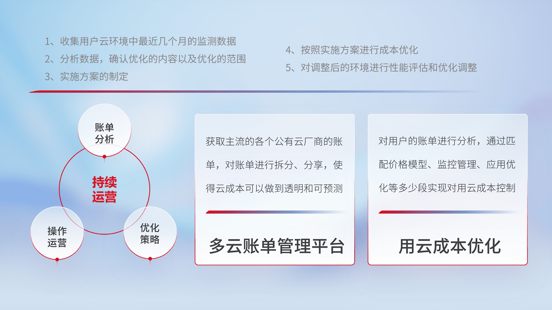 通过多云纳管,,,,以统一的资源数据模型把客户的云资源进行抽象和封装,,,,进而实现对多云资源的统一操作,,,保障云资源管理的可靠性、、稳定性与可用性。。。量身定制化运维内容,,配置、、、开发运维、、补丁管理、、备份、、、、监控、、认证和访问管理、、审计和日常巡检等,,,保障在用云过程中的可靠度,,,,稳定度以及高可用率。。。
