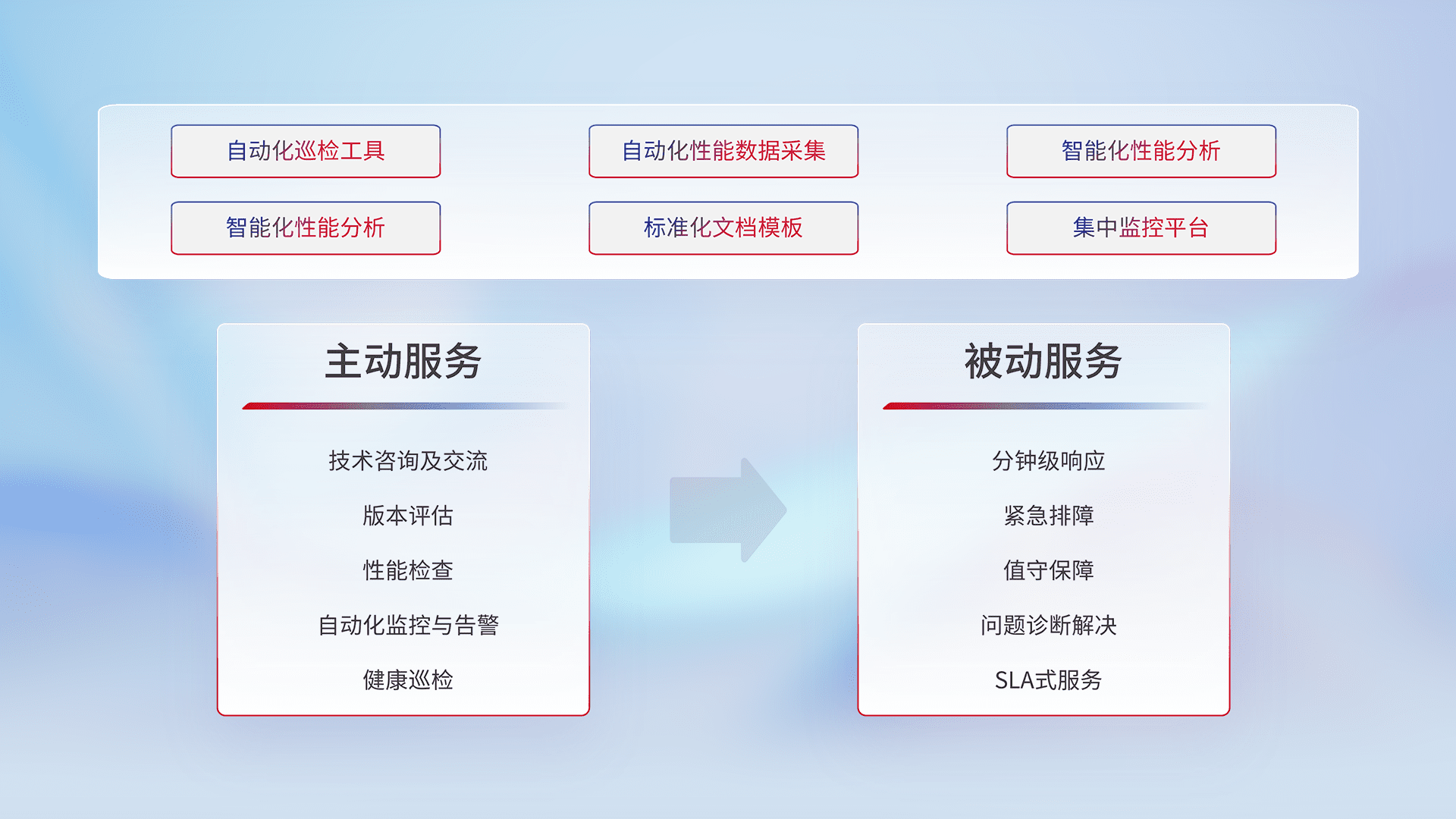 智能化工具和标准化文档,,,保障服务质量,,,提供主动服务(包含技术咨询、、、、版本评估、、、性能检查、、、自动化监控与告警、、健康巡检)和被动服务包含(分钟级响应、、、紧急排障、、、、值守保障、、、问题诊断解决、、SLA服务)。。。